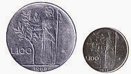 Moedas italianas de 100 liras de 1967 e 1991 com a deusa Atena e a oliveira.